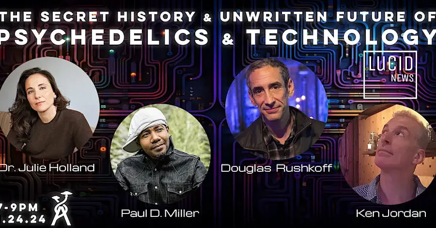 Join authors Douglas Rushkoff (Survival of the Richest: Escape Fantasies of the Tech Billionaires), Paul D. Miller (aka DJ Spooky), Julie Holland (Good Chemistry), and moderator Ken Jordan (Lucid News) for a freewheeling discussion about the intersection of tech and psychedelics. We will explore the question: “What could the technology industry learn from psychedelics, and what might the emerging psychedelics industry learn from the mistakes of Silicon Valley?”